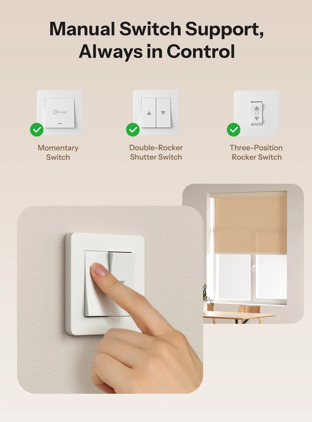 Goditi il meglio di entrambi i mondi: automazione intelligente e controllo fisico. Supporta la connessione ai tradizionali interruttori a parete, così puoi comunque aprire o chiudere manualmente le tende con la semplice pressione di un pulsante.