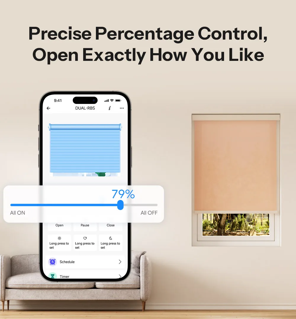 Lascia che le tue tende si fermino esattamente dove vuoi: niente più strappi o arresti a metà corsa. Grazie alla calibrazione intelligente, il sistema apprende l'intera corsa della tenda, così ogni apertura o chiusura è fluida, precisa e perfetta. Impostalo una volta e goditi la perfezione a mani libere ogni giorno.